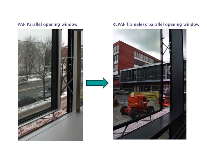 After 5 years of intensive developing works including the CE-certificate at the testing facilities, two Swiss patents finally the RLPAF is ready for the market. The advantage of a parallel opening window is, as the name already reveals, that the window opens parallel to the outside and therefore no precious living and working area is wasted. Due to the stack-effect the stuffy air can escape at the top of the window and new fresh air can flow in from the bottom.